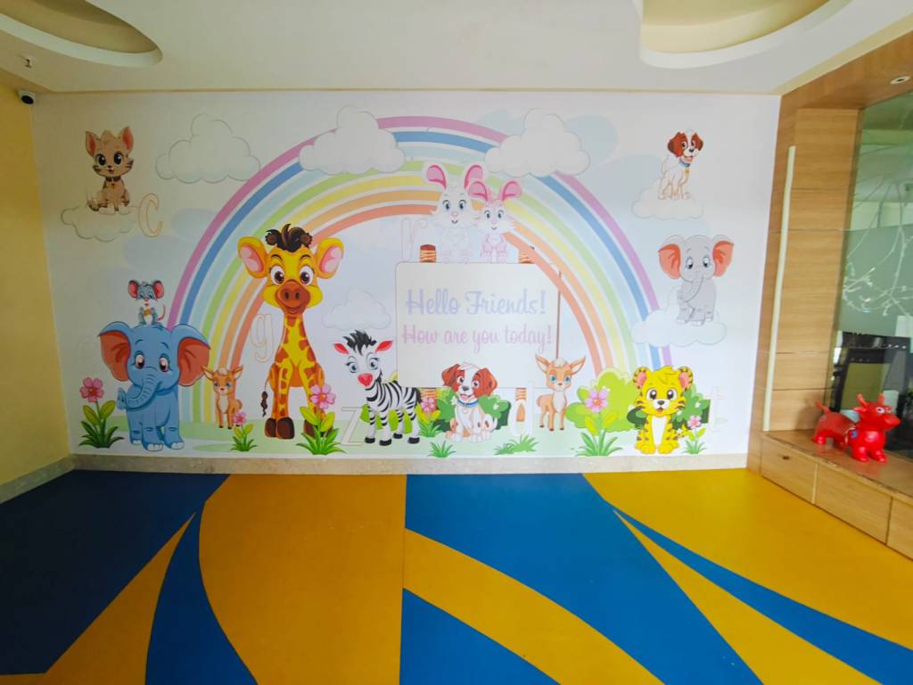 A small-kid appropriate themed Wallpaper was installed in the small kids’ room i.e. Toddler’s room. We also added some toys to add to their joy.