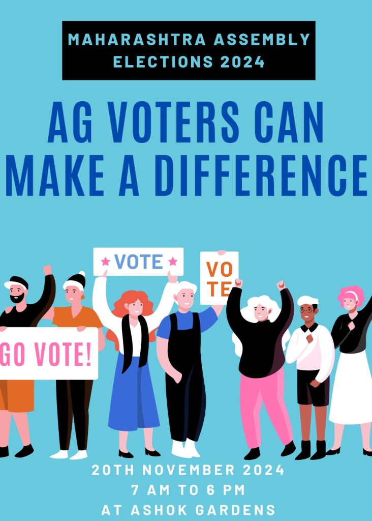 For the first time ever, Ashok Gardens hosted as a polling booth for AG residents during the recent Maharashtra Assembly elections. Having a voting centre right at the doorstep was a blessing for the voters of Ashok Gardens who participated in the process in very large numbers and very enthusiastically. We were overwhelmed by the excellent voting percentage at our centre.