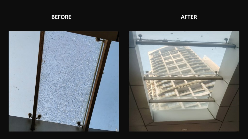Cracks were identified in the roof glass panel located above the first-floor lobby posing a potential safety hazard to users. The damaged glass panel has been safely replaced with a new panel ensuring safety compliance and restoring aesthetics.