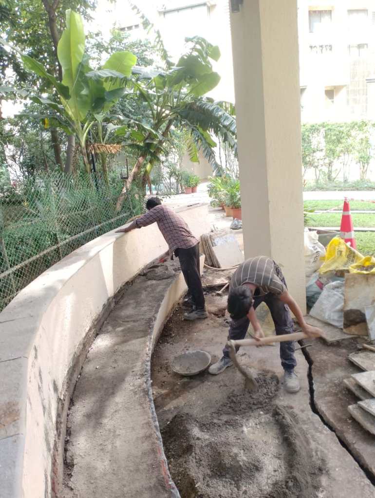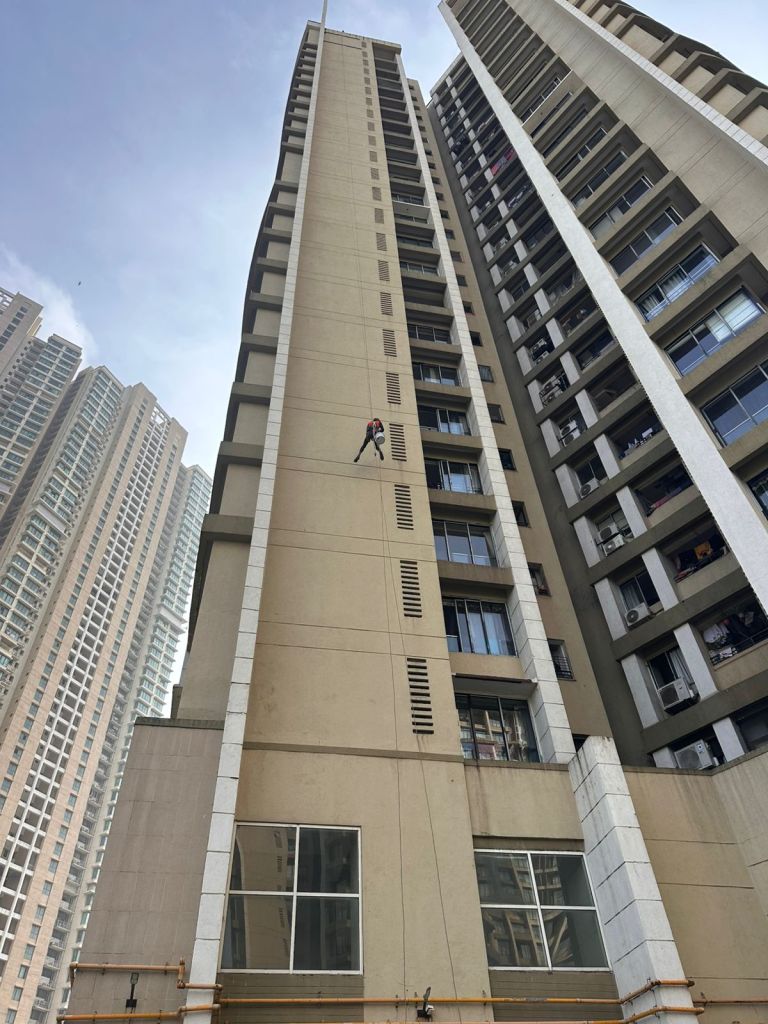 This survey covered common areas, including floor lift lobbies, staircases, terraces, refuge floors, expansion joints & individual flats. The survey was done to inspect for structural defects and leakages. The external façade survey of the two towers was done in the last quarter. The visual survey was completed. The vendor used high precision binoculars to check the building façade. The team also used the Spider-Man technique on the dead walls [plain walls without windows] to assess the wall condition by gently tapping the surface and identifying any weak areas.